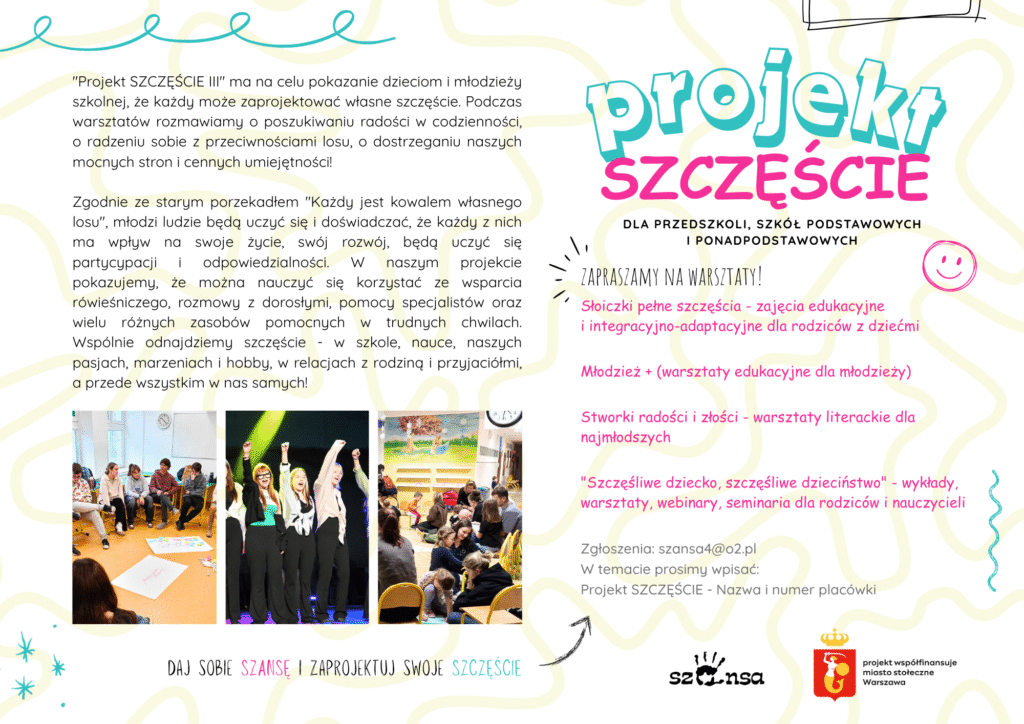 Dobrostan psychiczny jest wielowymiarowym pojęciem. Można go zdefiniować jako efekt poznawczej i emocjonalnej oceny własnego życia, na którą składają się: wysoki poziom spełnienia i satysfakcji życiowej. Dobrostan oznacza także, że potrafimy przywołać wiele przyjemnych wspomnień z naszego życia. „Projekt SZCZĘŚCIE” ma pokazać dzieciom i młodzieży szkolnej, że każdy może zaprojektować własne szczęście. Poczucie szczęścia nie tylko zwiększa motywację do działania stanowiąc swoisty impuls zwiększający naszą aktywność. Chcemy pokazać dzieciom i młodzieży, że każdego spotykają niepowodzenia, ale można nauczyć się korzystać ze wsparcia rówieśniczego, wsparcia dorosłych, pomocy specjalistów, poszukiwania i korzystania z innych zasobów, które nie do końca młodzi ludzie sobie uświadamiają. Na tym nie kończy się nasza rola. Dla nas w naszych działaniach „wzmacniających” młodych ludzi w ich drodze do dorosłości istotna jest również trzecia warstwa wzmacniająca początkowy poziom dobrostanu, czyli satysfakcja cząstkowa, którą odczuwać będą uczestnicy proponowanych przez nas zajęć z różnych dziedzin życia społecznego, w toku których wykorzystywać będą posiadane już zasoby intelektualne i twórcze zwiększające ich poczucie tzw. kompetencji miękkich.