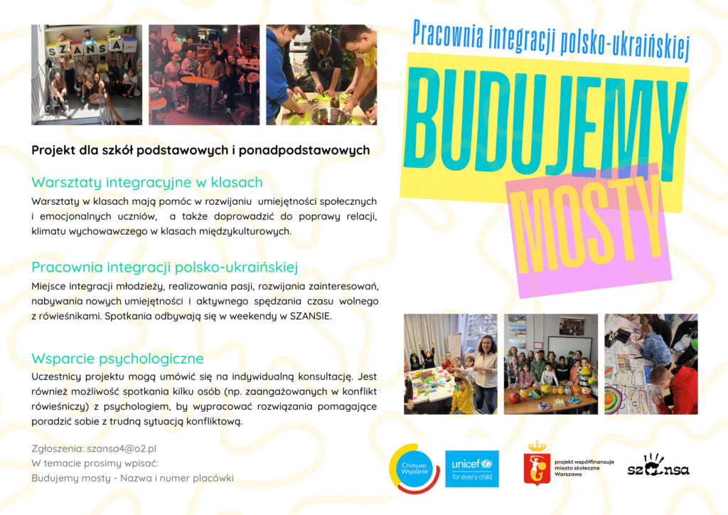 Projekt skierowany głównie do młodzieży polskiej i ukraińskiej polega na integracji z uwzględnieniem różnic międzykulturowych. Działania, na których się skupiamy to klub młodzieżowy, warsztaty twórcze, kulinarne, odkrywanie ciekawych zakątków Warszawy i ich okolic, zajęcia sportowe. Zwracamy uwagę na potrzeby młodzieży, realizujemy warsztaty z zakresu komunikacji, radzenia sobie ze stresem, oferujemy konsultacje z psychologiem, pomoc tłumacza. Organizujemy lekcje języka polskiego, a w roku szkolnym udostępniamy stanowiska komputerowe do nauki zdalnej.